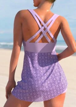 Lace Stitching Light Purple Cross Strap Swimdress And Shorts