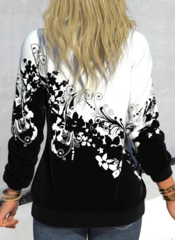 Geometric Print Zipper Turquoise Turn Down Collar Sweatshirt