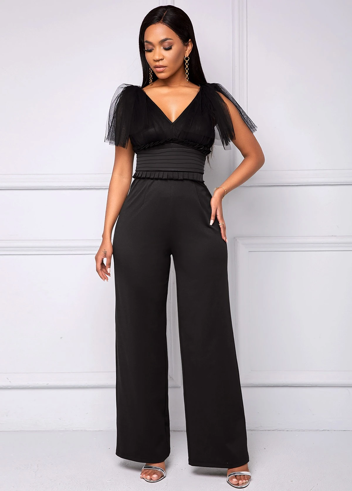 V Neck Black Mesh Stitching Jumpsuit