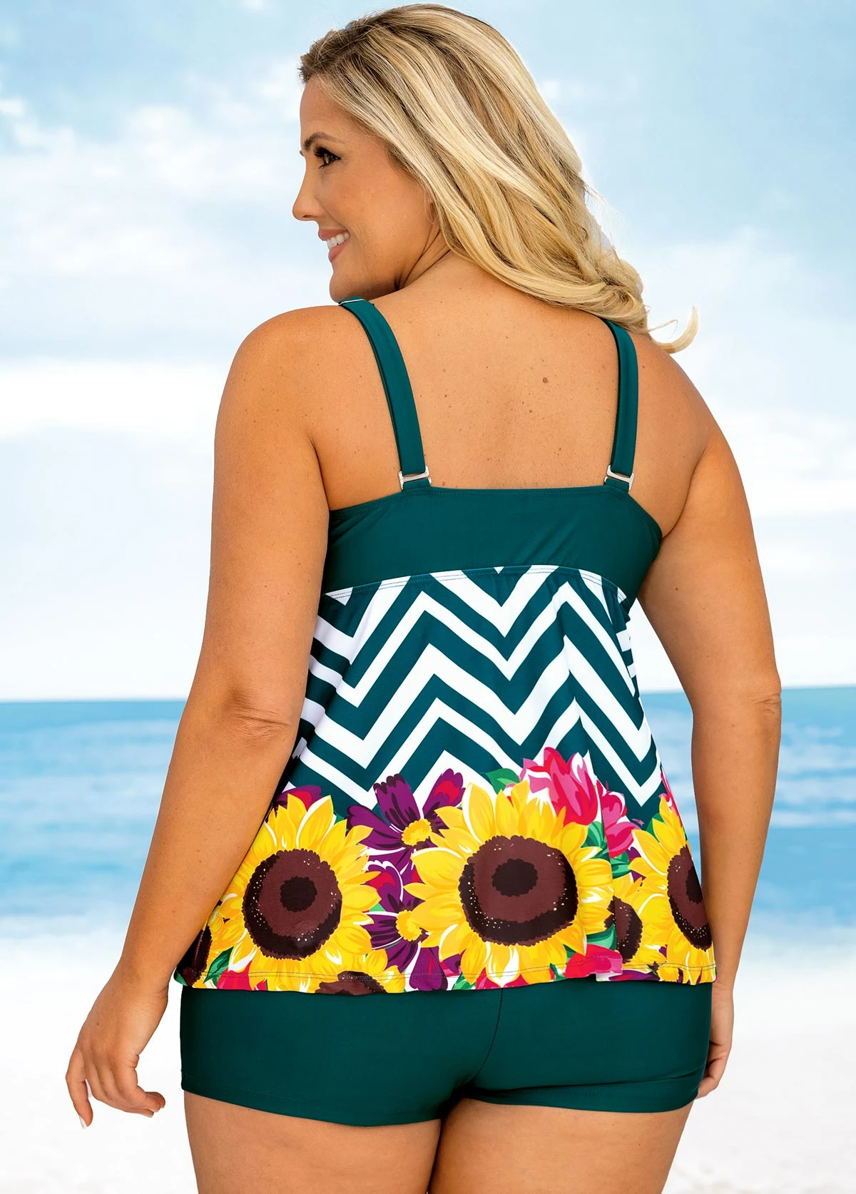 Wide Strap Plus Size Floral And Chevron Print Tankini Set
