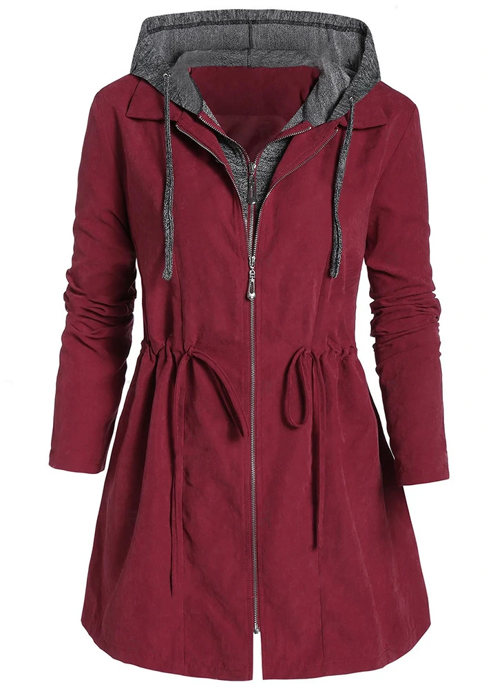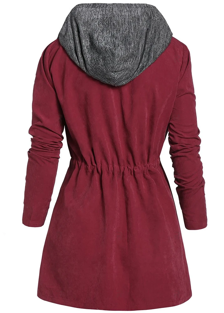 Wine Red Plus Size Drawstring Long Sleeve Coat